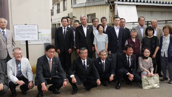 除幕式参加者(中央が白虎隊士石田和助ご子孫) |